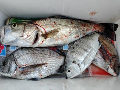 ■釣行日 令和8年4月11日 ■釣 場 児島筏にて 奥城丸さんにて ■魚 種 チヌ28~35cm 3匹 セイゴ 45cm 1匹 ■仕掛け ハリス3号 3号針 オモリ1号 竿4.5m ■エ サ シラサエビ